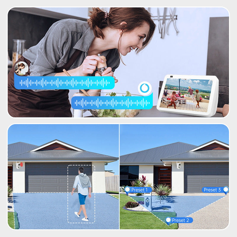 SMART AUTOMATISK SPÅRNING: Spårningsfunktionen säkerställer att kameran automatiskt följer rörliga objekt i realtid. Denna funktion ger kontinuerlig övervakning, fångar varje detalj och förbättrar säkerheten genom att hålla fokus på dynamiska aktiviteter.